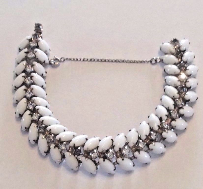 Vintage silvertone milk glass and rhinestone bracelet