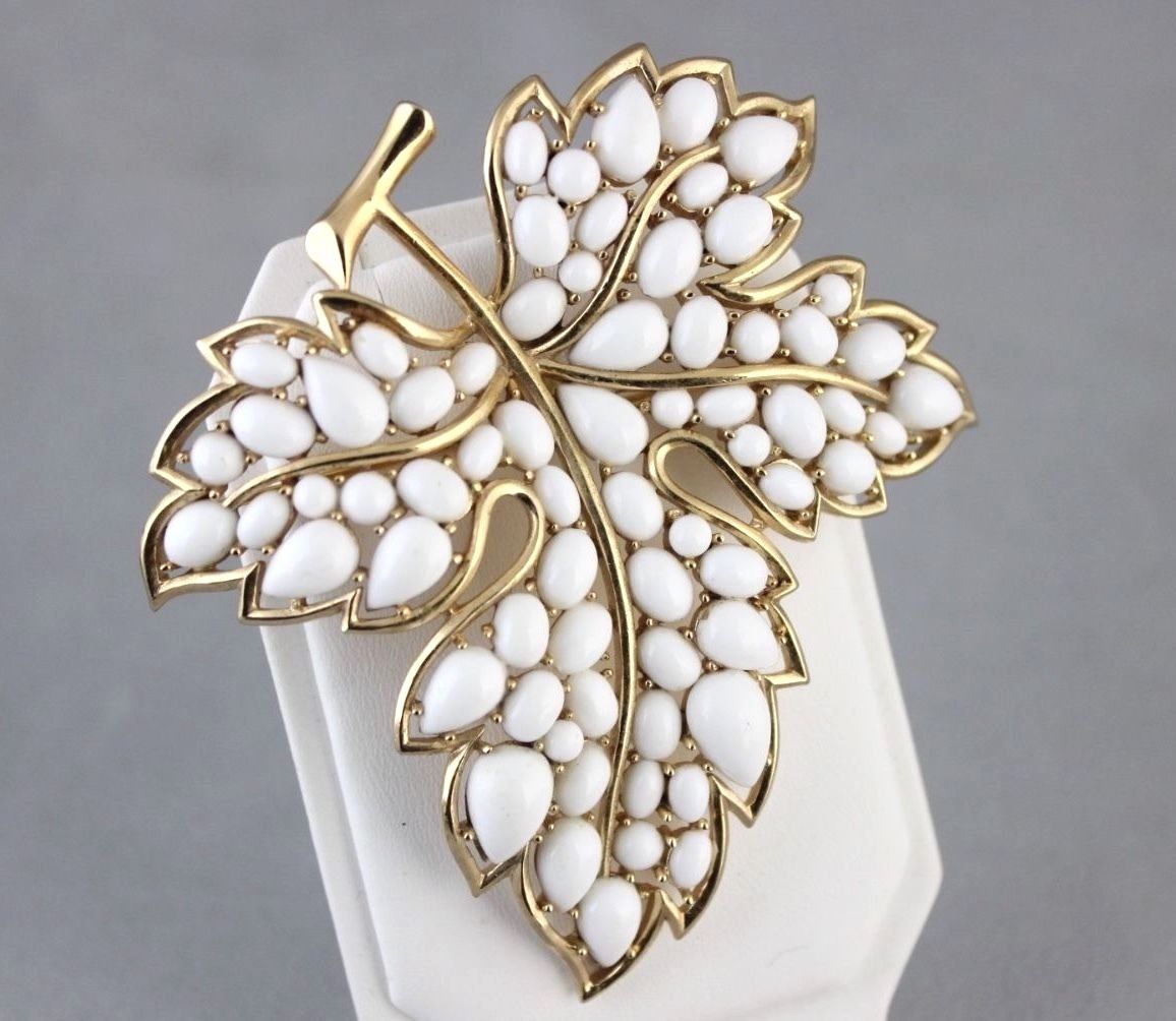 Title (ebay affiliate link): *RARE* VINTAGE Designer Signed CROWN TRIFARI LEAF BROOCH White Milk Glass