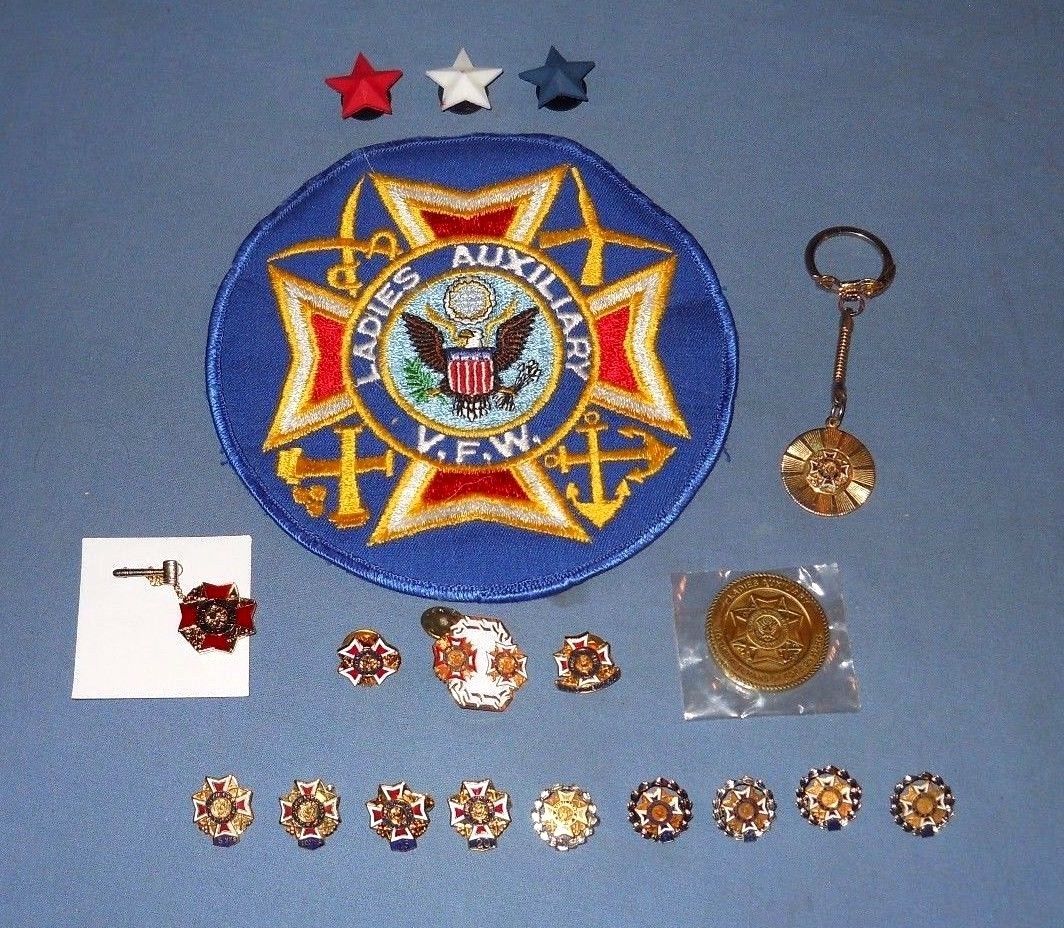 Title (ebay affiliate link): Vintage Lot of VFW Auxiliary Service Pins, Patch, Key Chain, & other pins