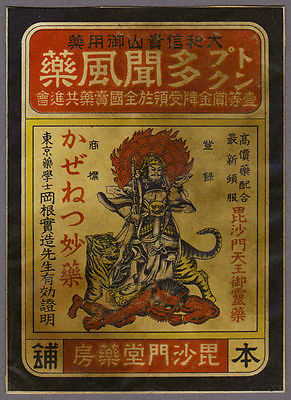 Vintage Japanese Medicine Envelope "Tamon Kazegusuri", Bishamonten, Tiger, Oni