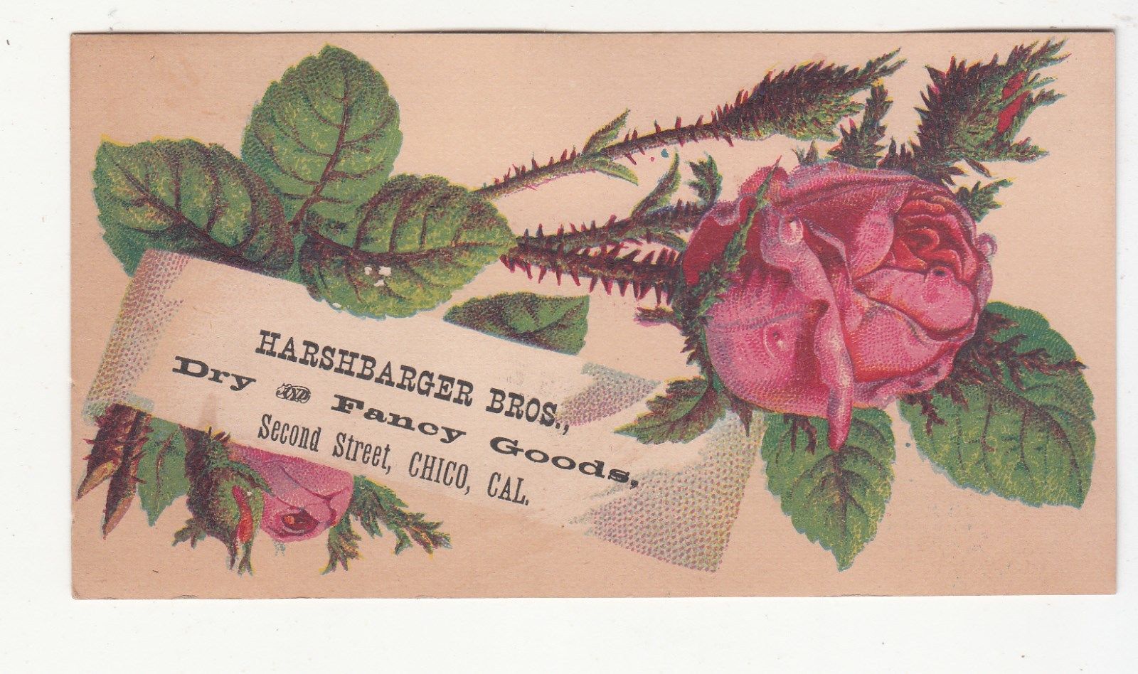 Harshbarger Bros Dry Goods Chico California Pink Rose Vict Card c1880s