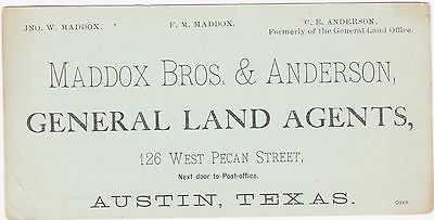 RARE 1800s TEXAS GENERAL LAND AGENT MADDOX BROS & ANDERSON BUSINESS CARD AUSTIN
