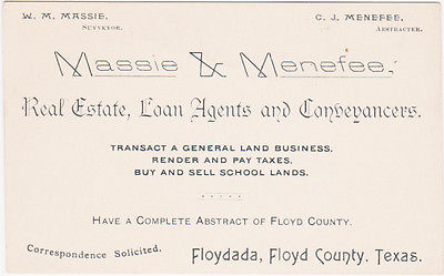 RARE 1800s MASSIE & MENEFEE REAL ESTATE LANDS TEXAS BUSINESS CARD FLOYDADA TEXAS
