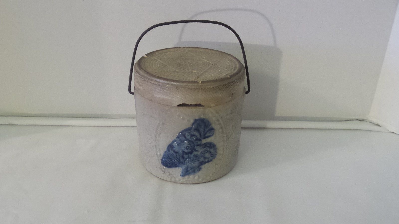 Title (ebay affiliate link): Antique Stoneware Pottery Salt Glaze Blue Flower Crock Jar Wire Bail Star on Lid