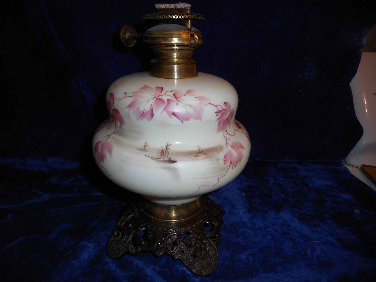 Title (ebay affiliate link): ANTIQUE 1870'S OIL LAMP, HAND PAINTED FONT WITH SHIPS, CAST IRON BASE, CLIMAX