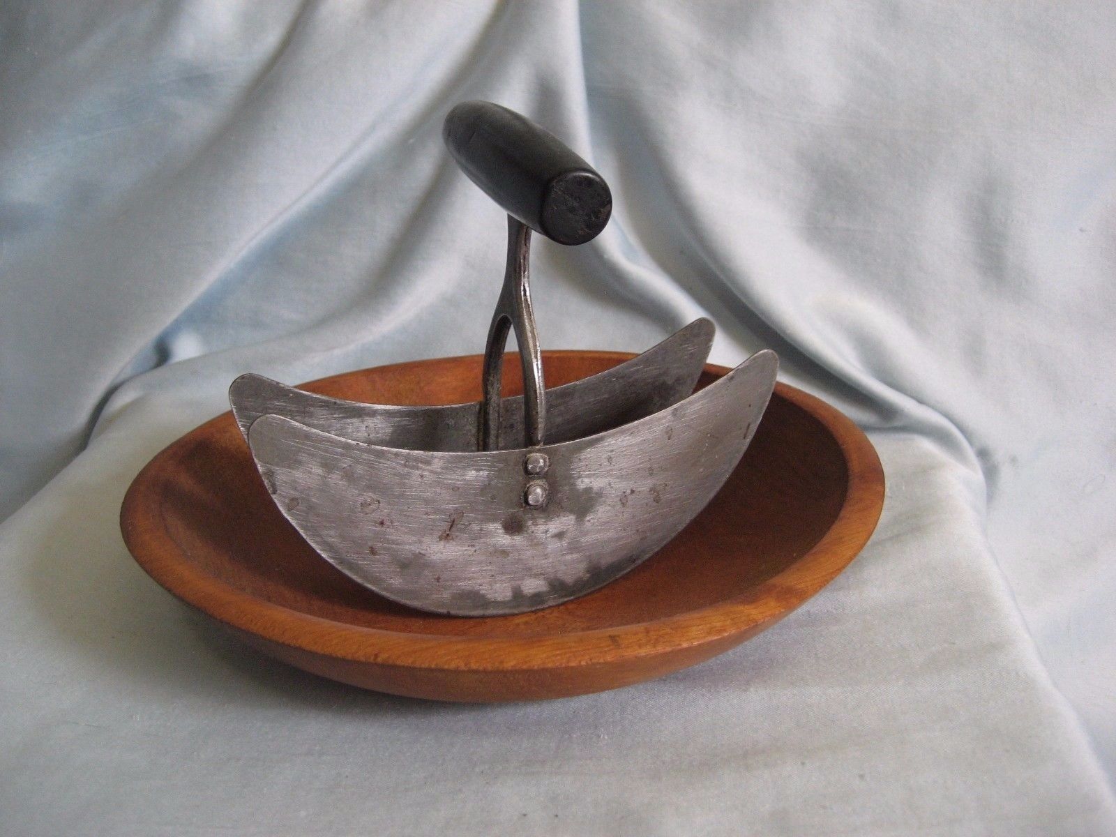 Title (ebay affiliate link): Antique Primitive Hand-Turned Wooden Bowl w/Vtg. Double Blade Curved Nut Chopper