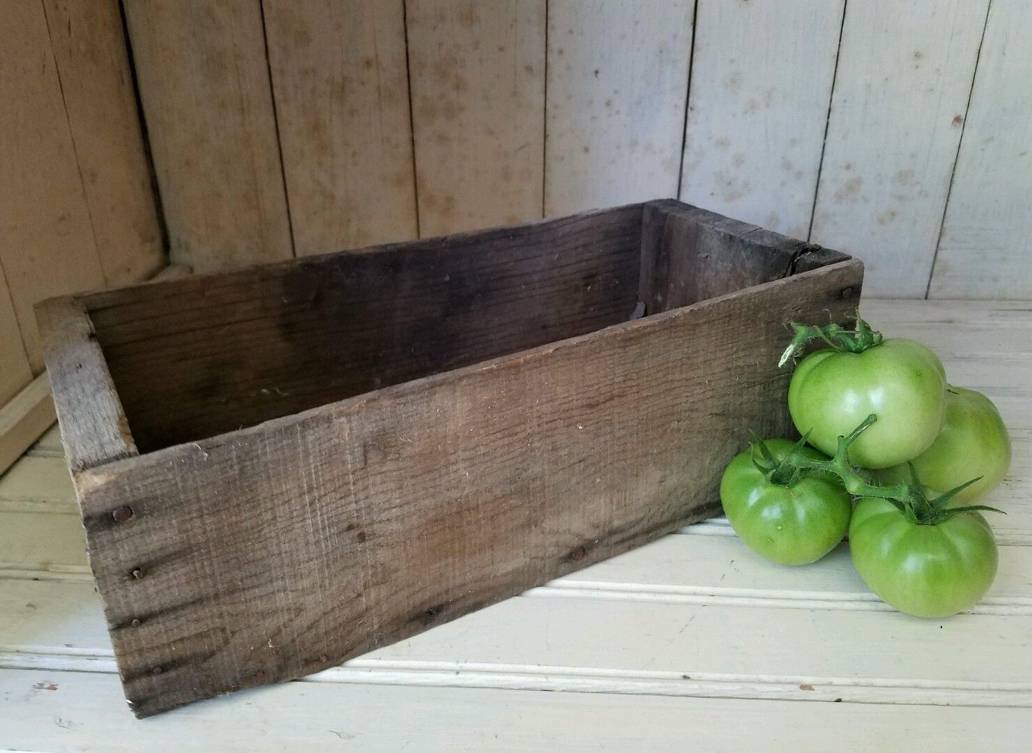 Title (ebay affiliate link): Antique Vintage Wood Carpenter Tool Box Wooden Tote Primitive Sorting Bin Tray