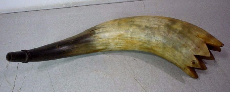 Title (ebay affiliate link): Antique Black Powder Horn, Hand carved Large Powder Horn with carved ends.