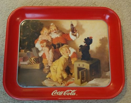Title (ebay affiliate link): VINTAGE 1986 COCA COLA METAL TRAY CHRISTMAS SANTA CHILDREN DOG