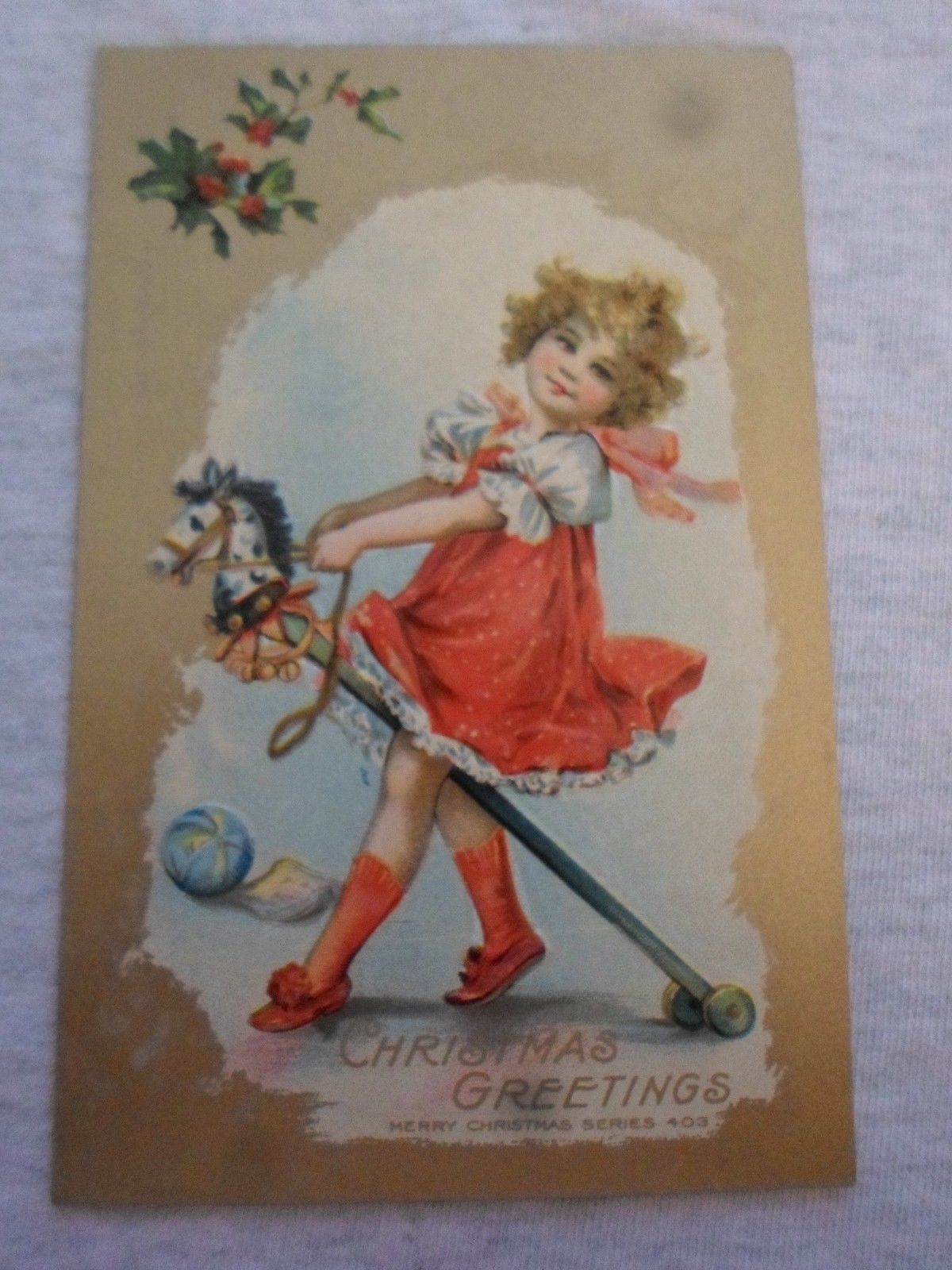 Title (ebay affiliate link): Christmas Greetings Girl in red riding a Hobby Horse Antique embossed postcard