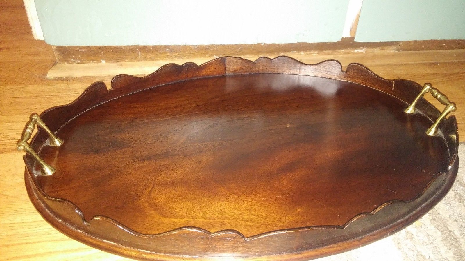 Title (ebay affiliate link): GORGEOUS Vtg EDWARDIAN Large Oval MAHOGANY Gallery Tray w/Brass Handles~22"x16"!