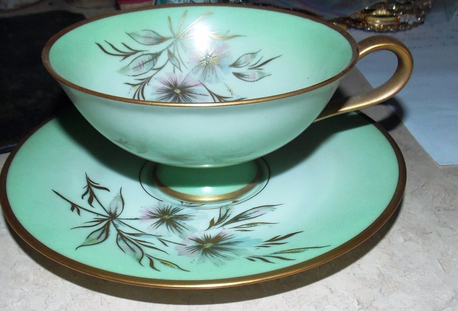 Title (ebay affiliate link): Vintage Retro AOFI Bavaria Porcelain Teacup Saucer Set Green Flower Pink Gray