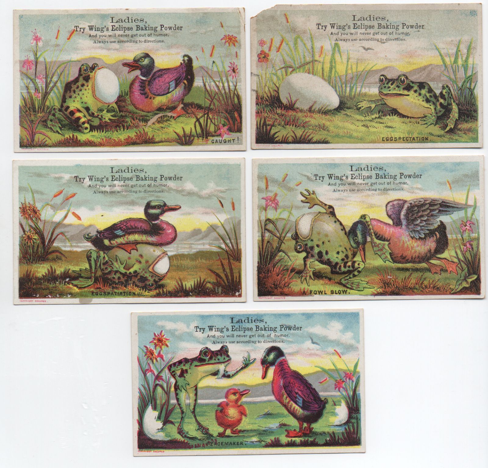 Victorian Trade Card set of 5 WINGS ECLIPSE BAKING POWDER Duck Frog & Egg story
