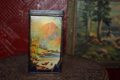 Antique Vintage 5.5" Tea or Candy Tin Art Deco Mountains Lake Trees Cattle Deer