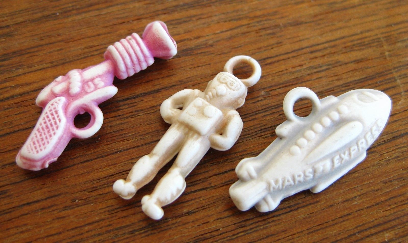 Title (ebay affiliate link): 3 Vintage Outer Space Mars Express Spaceship Ray Gun Cracker Jack Prizes Charms