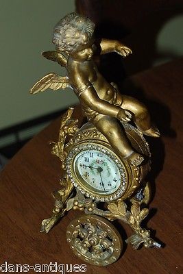 Antique New Haven gold gilt clock with cherub on a cart design and jeweled dial