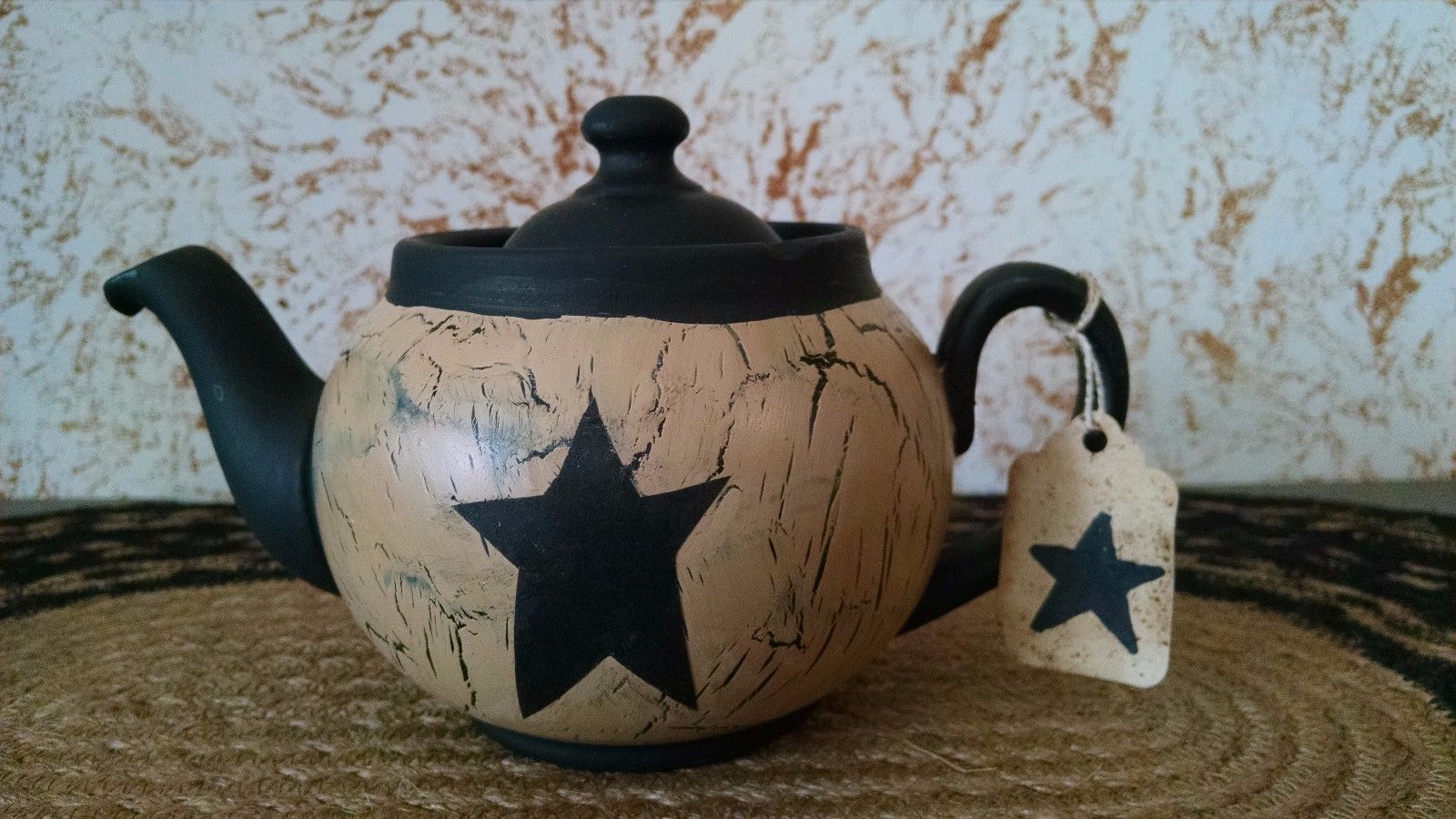 Title (ebay affiliate link): Primitive Crackled Country Tan/Black Tea Pot Farmhouse Decor