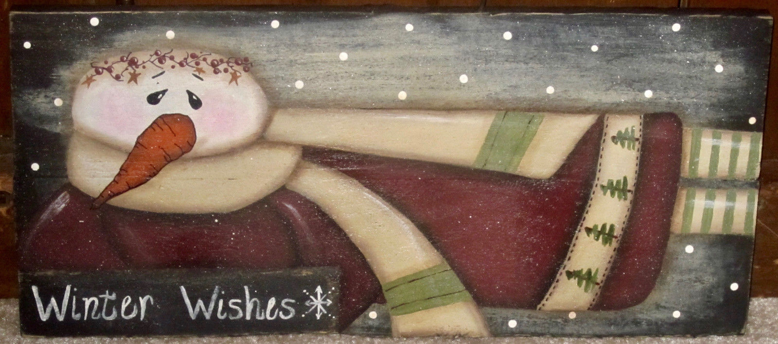 Title (ebay affiliate link): *~*PRIMITIVE*~* HP FOLK ART FLYING SNOWMEN * WINTER WISHES*~* OLD RECLAIMED WOOD