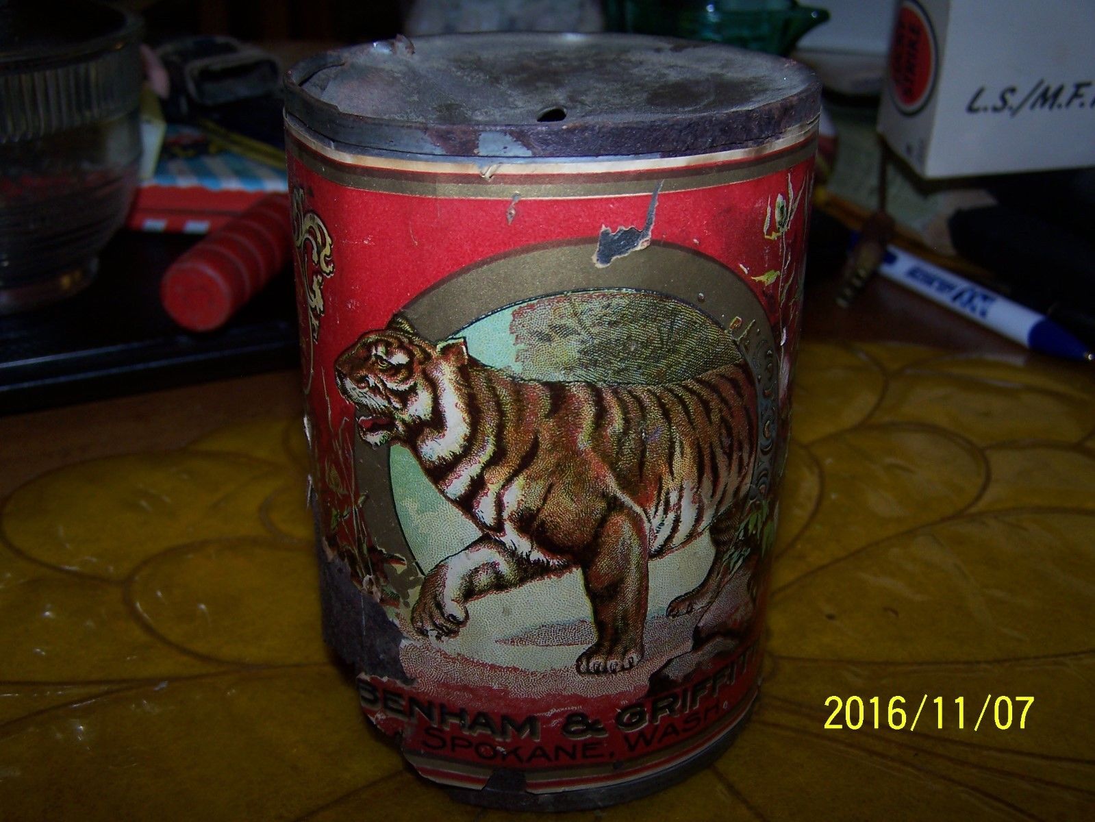 AMAZING OLD ORIGINAL SPOKANE WASHINGTON BENHAM GRIFFITH TIGRESS JUNE PEAS CAN!..