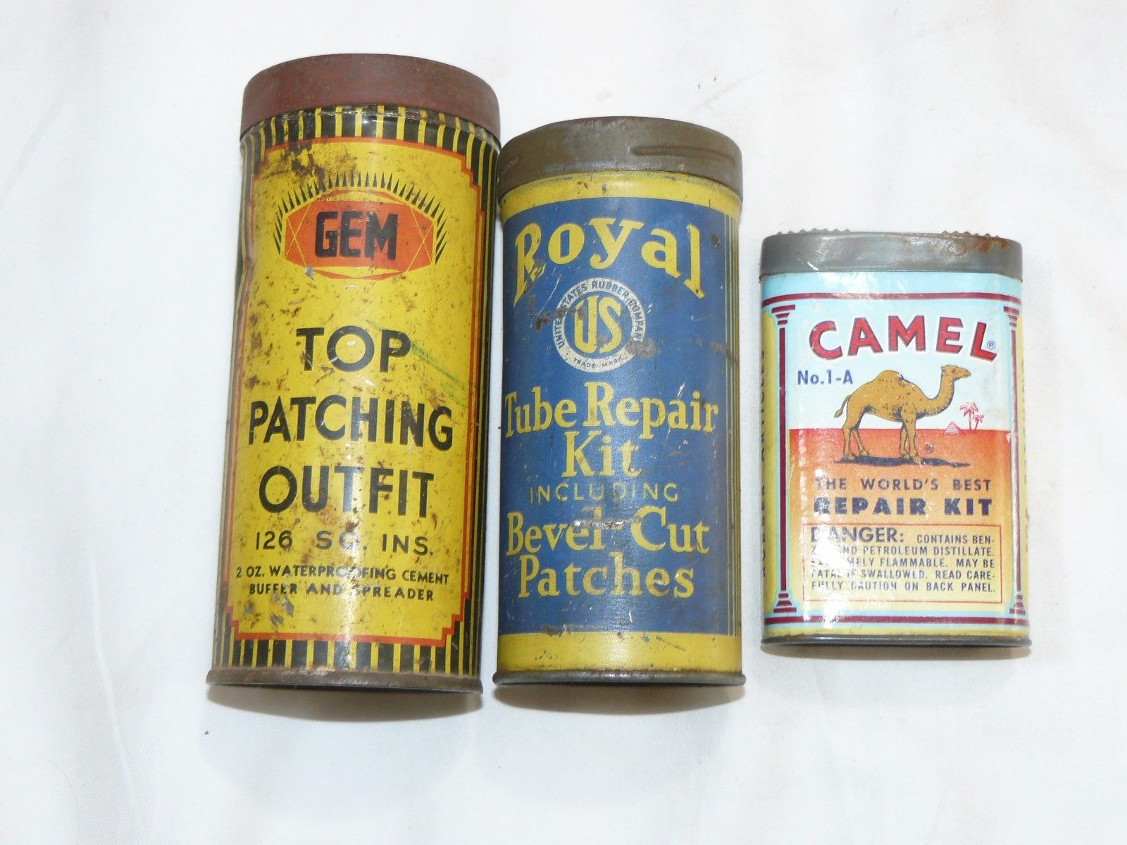Title (ebay affiliate link): 3 Vintage Tire/Tube Patch Kit Containers Tins Camel GEM Royal