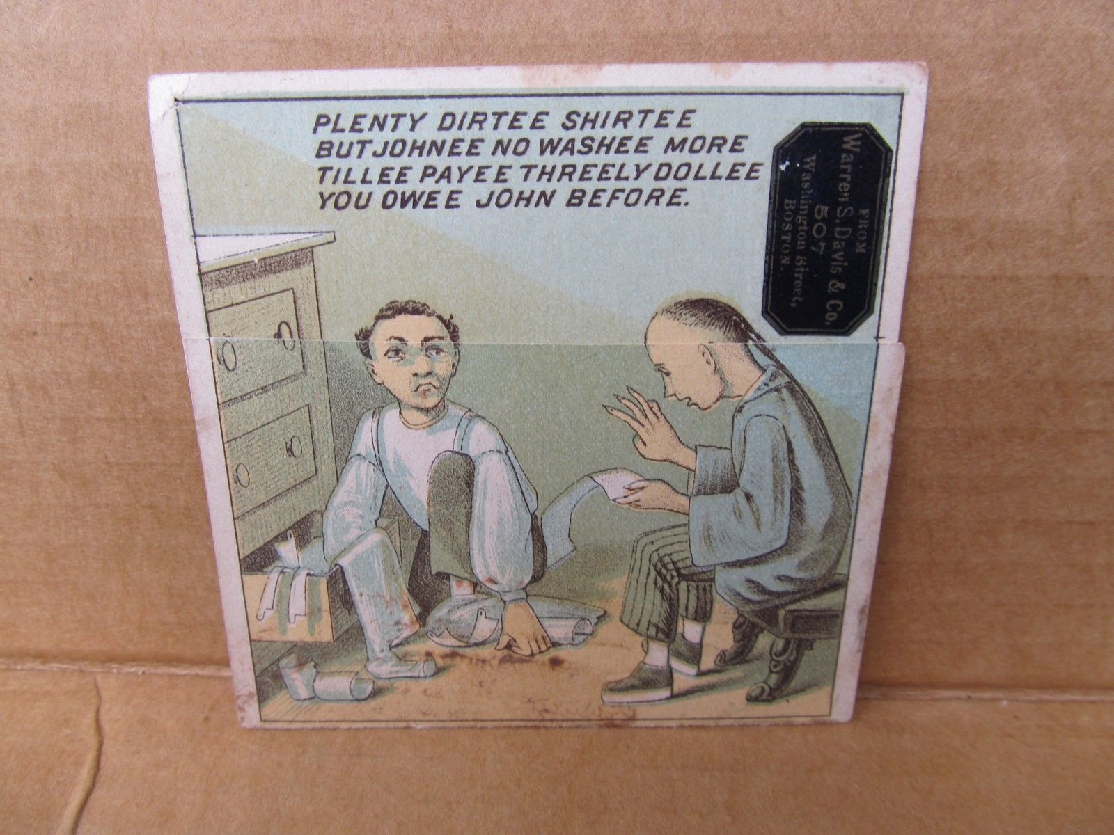 Title (ebay affiliate link): 1880's Humorous Fold-Down Trade Card / Chinese Dirtee Shirtee / Davis - BOSTON