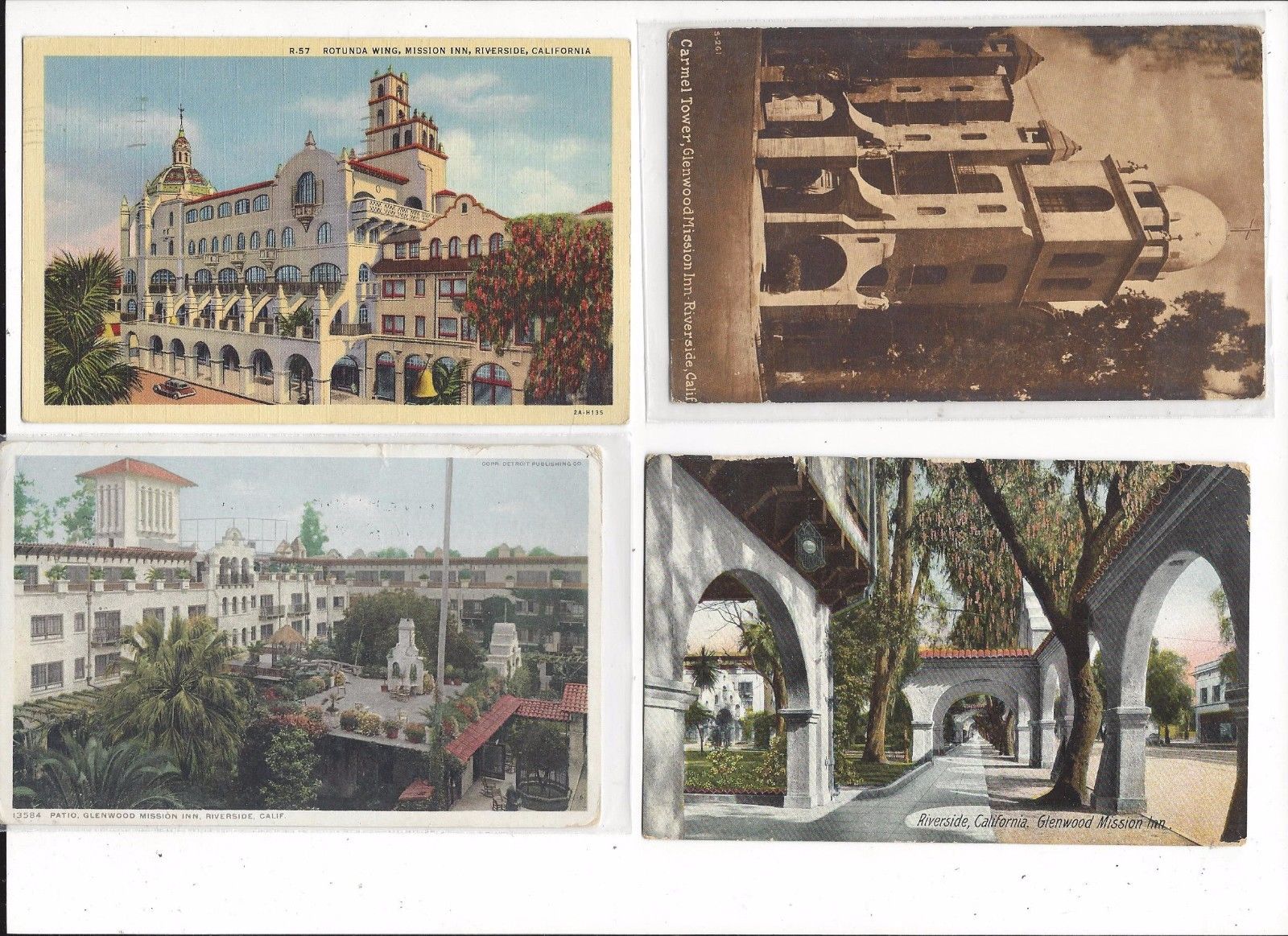 AJ POSTCARDS 4-POSTMARK 1910-1944 GLEENWOOD MISSION INN RIVERSIDE CALIFORNIA