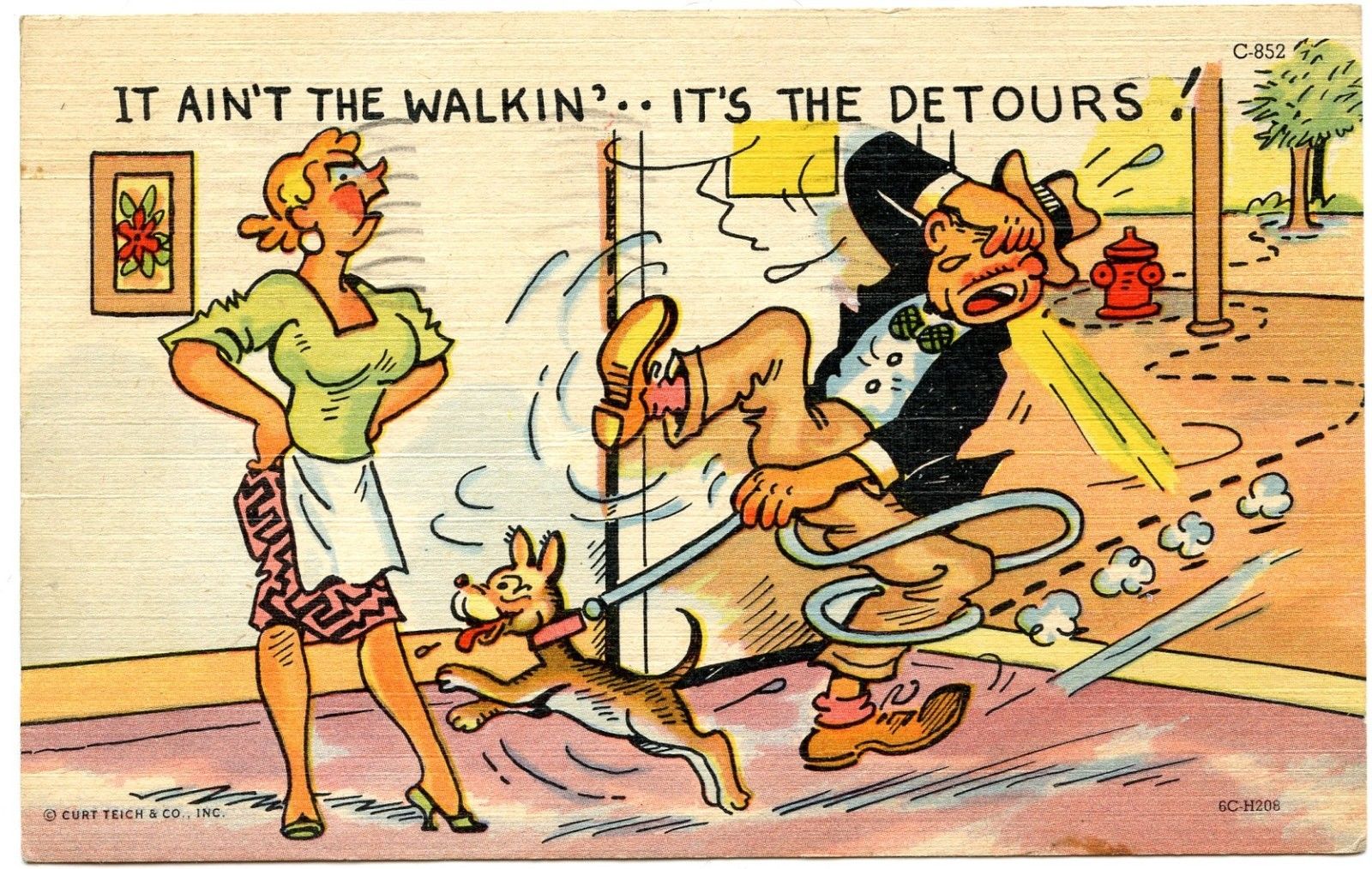 B5090 It ain't the walkin' -- it's the detours! Wife Man Dog 1956 Teich Linen PC