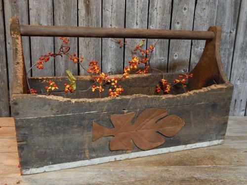 Title (ebay affiliate link): Antique Primitive Rustic Wood Tool Box Tote Carrier w/ Copper Oak Leaf 24"
