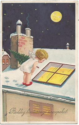 Christmas, Angel on The Roof Watching the House in a Window, Cute Old Postcard
