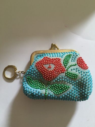 Title (ebay affiliate link): Vintage Baby Blue Floral Beaded Change Coin Money Purse Snap Closure & KeyChain
