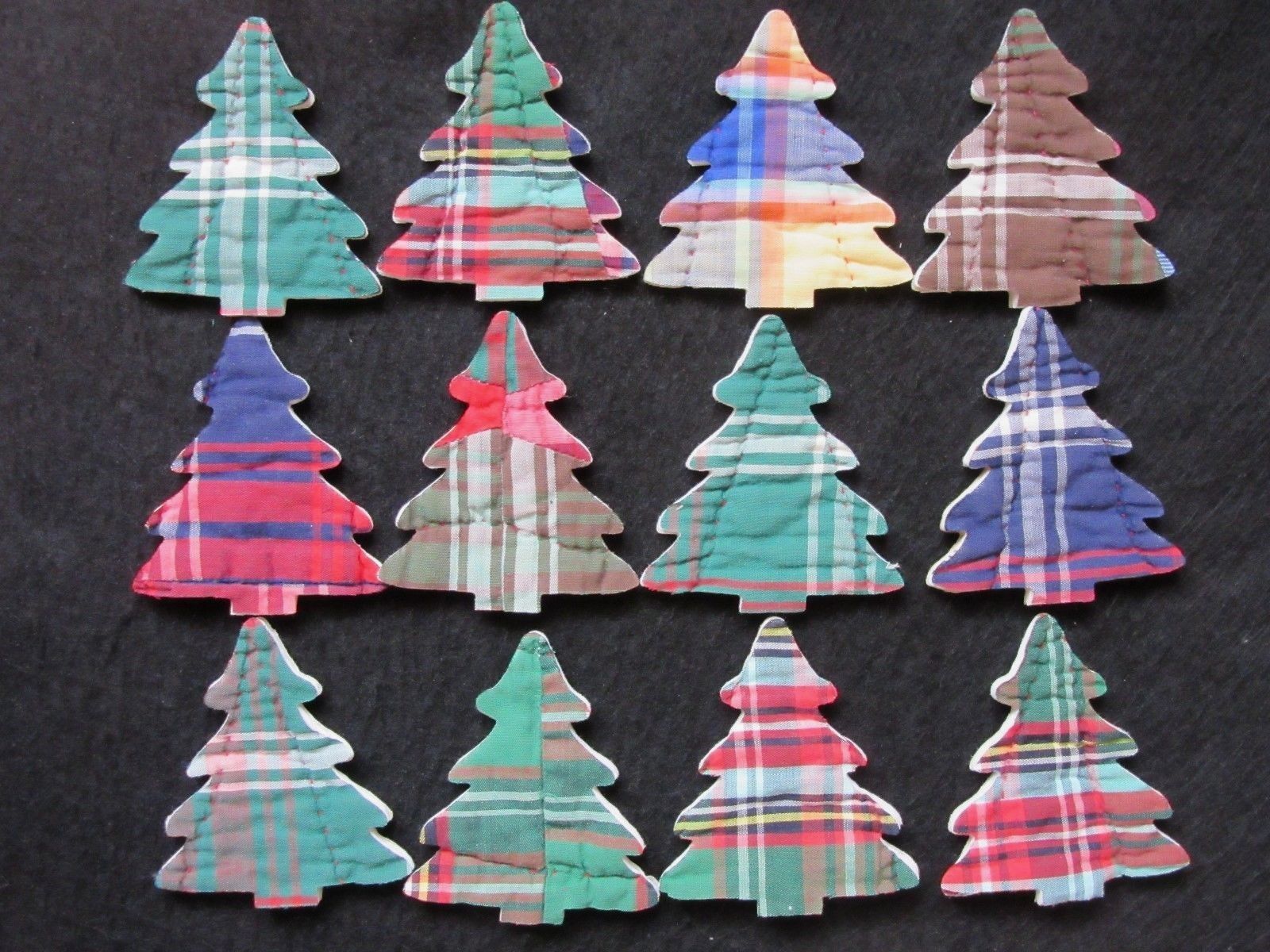 Title (ebay affiliate link): 12 PRIMITIVE CUTTER QUILT PLAID CHRISTMAS TREES - SCRAPBOOKING - ORNAMENTS!