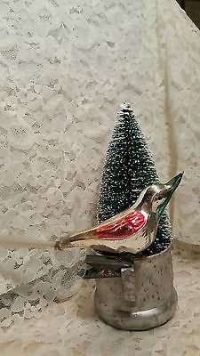 Vintage Primitive Childs Cup w/Bottle Brush Christmas Tree & Old Glass Bird Orn