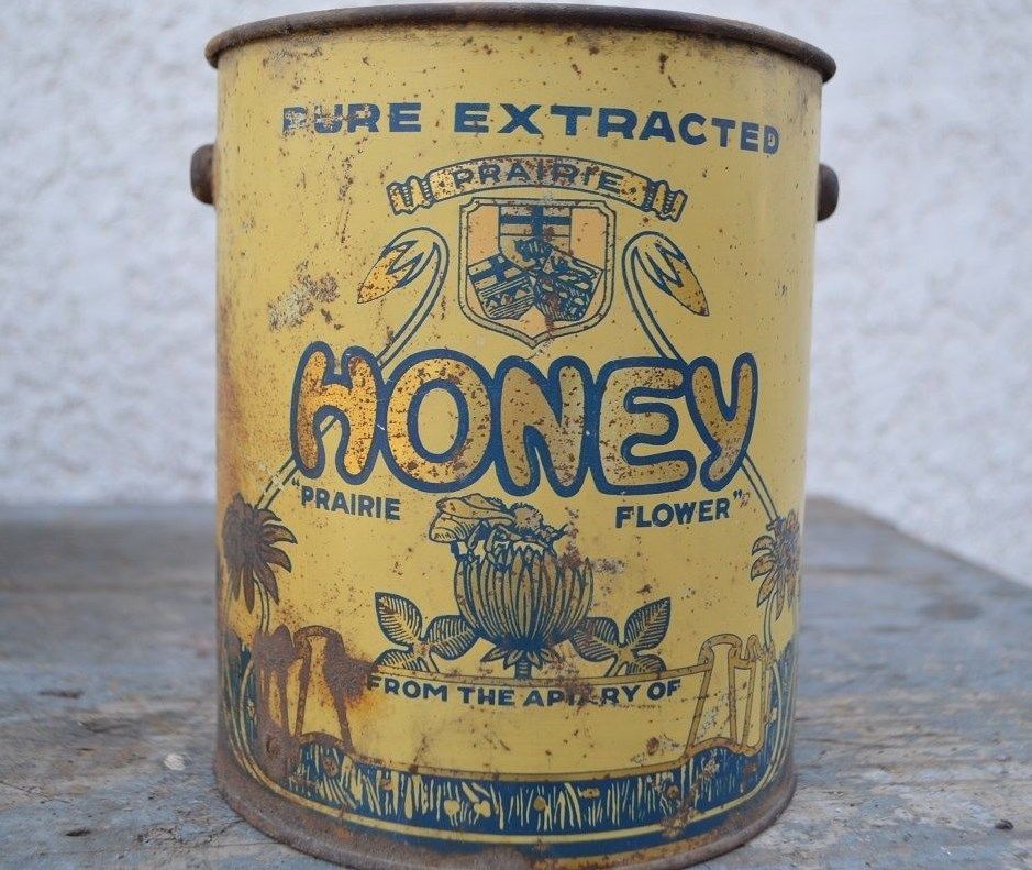 Title (ebay affiliate link): VINTAGE PRAIRIE HONEY TIN CAN Bees Hive Recipe Kitchen Decor MANITOBA ALBERTA