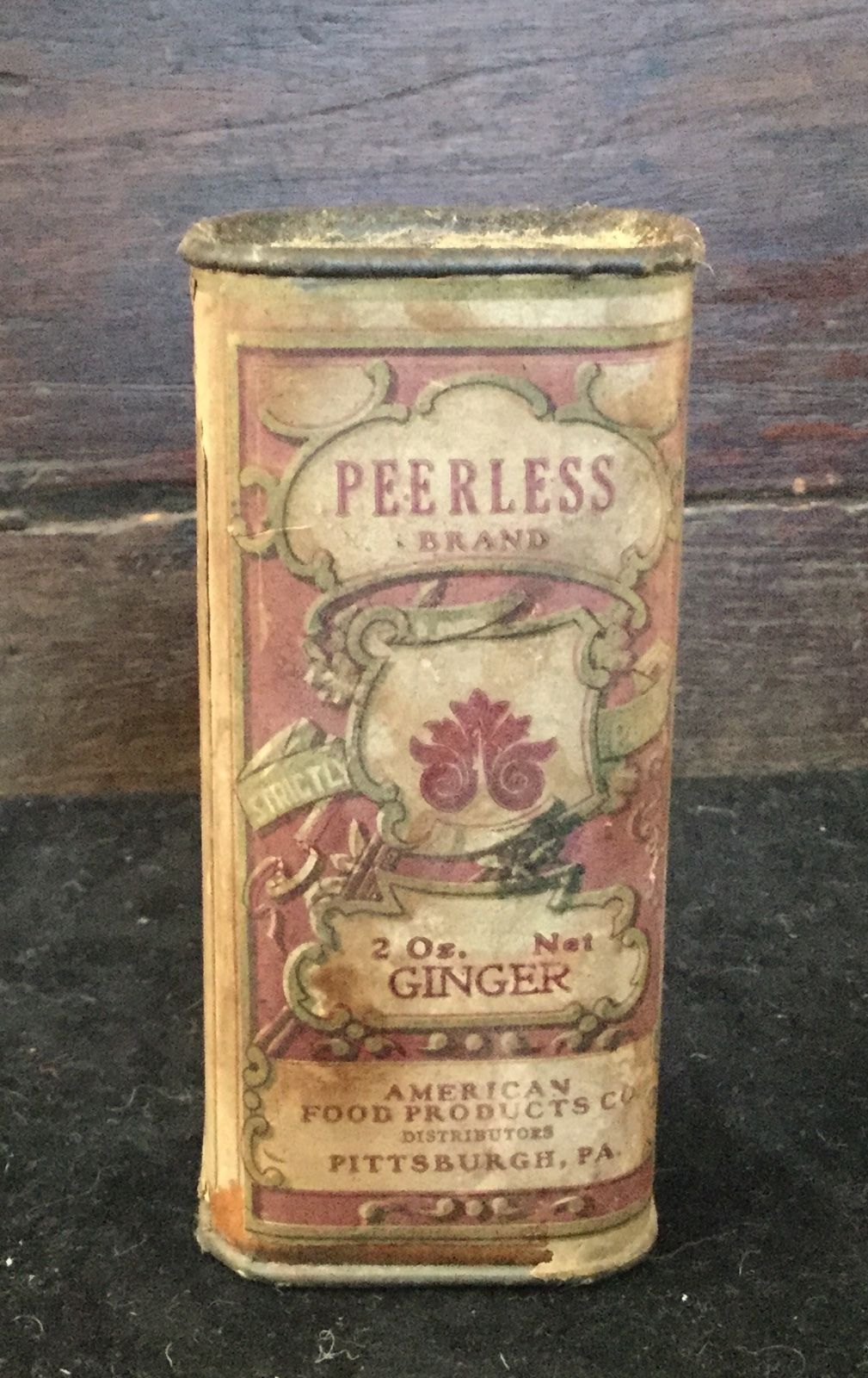 Title (ebay affiliate link): VINTAGE PEERLESS BRAND GINGER TIN PAPER LABEL PITTSBURGH PA 2 OZ