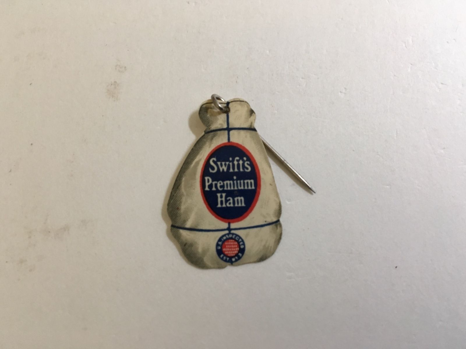 Title (ebay affiliate link): Swift's Premium Ham die-cut celluloid advertising stickpin