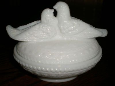 VTG WESTMORELAND MILK GLASS LOVE BIRDS DRESSER JAR DISH