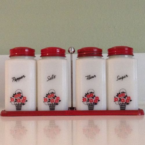Title (ebay affiliate link): Vintage SET of 4 MILK GLASS FLOWER BASKET SHAKERS ,SALT ,PEPPER ,FLOUR ,SUGAR.