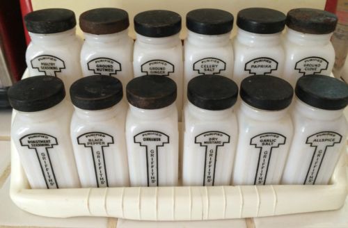 Title (ebay affiliate link): Vintage Griffith's Milk Glass 12-Piece Spice Set & Plastic Rack Rare White Black