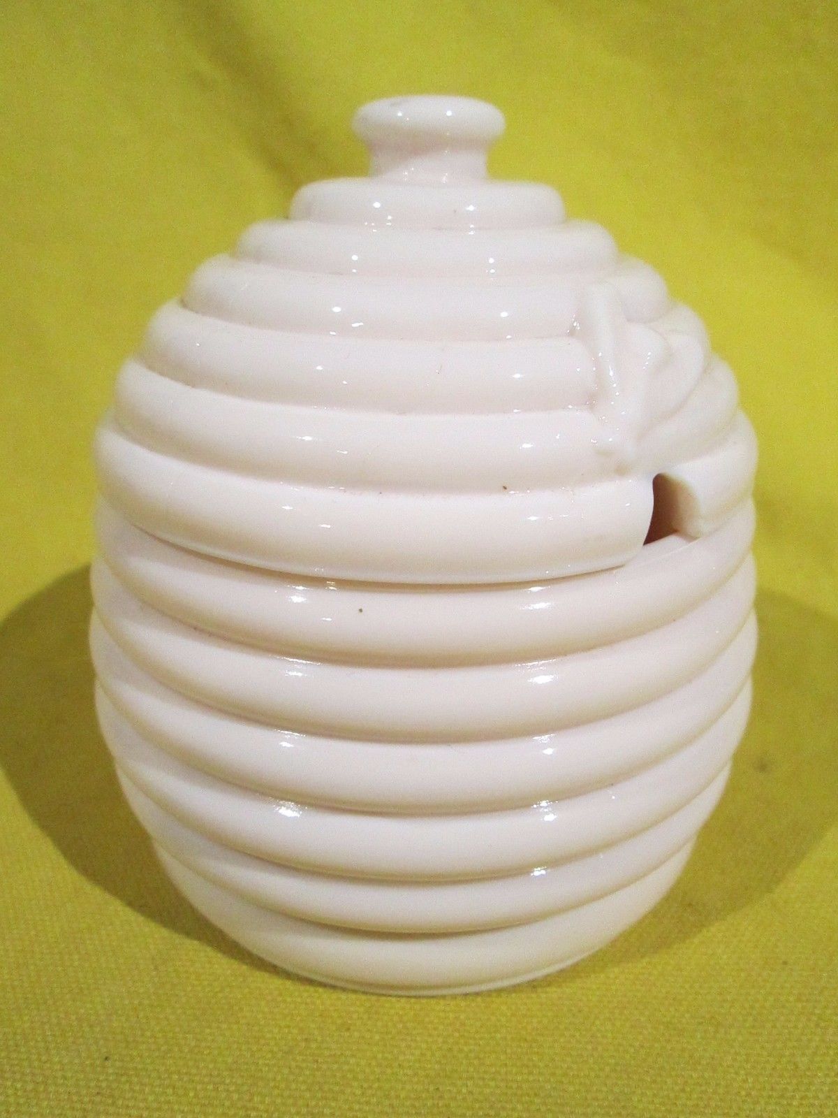 Title (ebay affiliate link): VINTAGE MID CENTURY RETRO 1940's SHELL PINK MILK GLASS BEEHIVE HONEY POT JAR