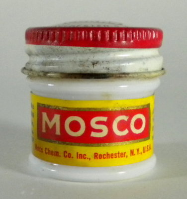VINTAGE MEDICINE MOSCO MILK GLASS JAR/BOTTLE PAPER LABE