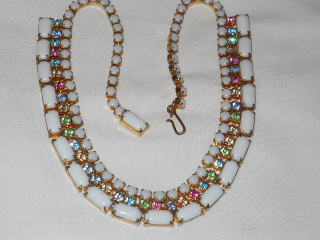 vtg milk glass and pastel rhinestone necklace pink,gree