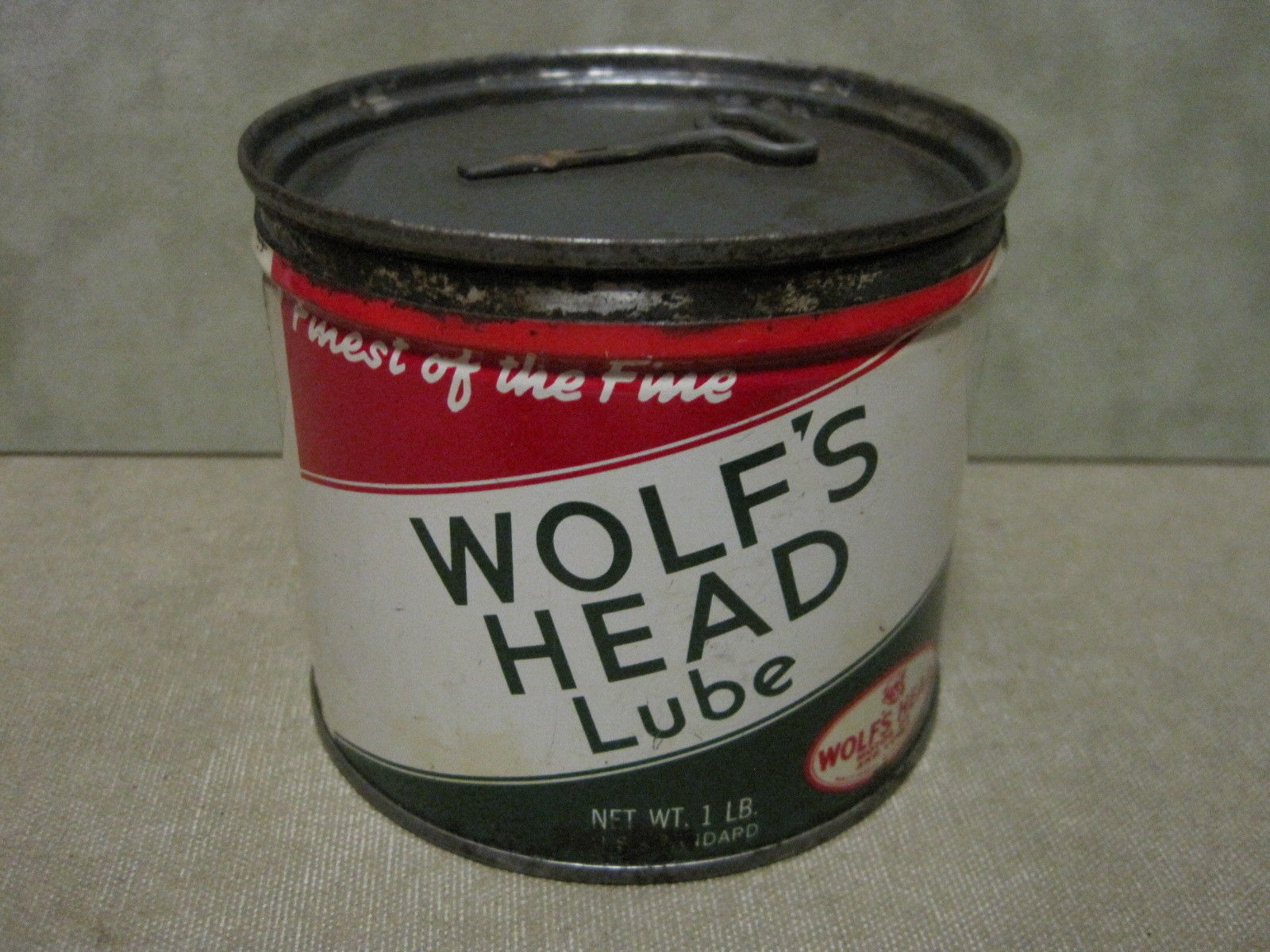 Title (ebay affiliate link): Wolf's Head 1 Pound Size Grease Can with Some Contents from 1950s