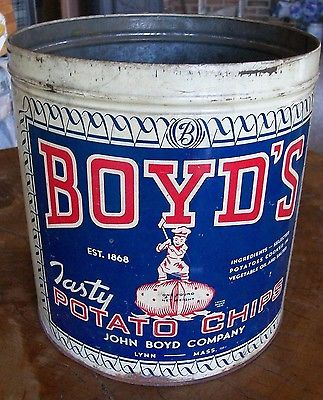 Title (ebay affiliate link): Vintage BOYD'S Tasty Potato Chips Can/ Tin 1 lb. LYNN, MASS