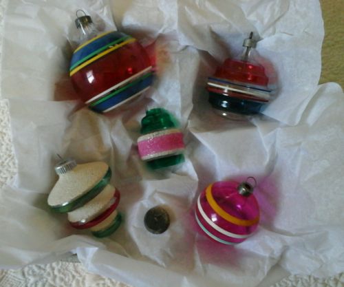 Title (ebay affiliate link): VINTAGE LOT 5 UNSILVERED GLASS ORNAMENTS STRIPES SHAPES MICA