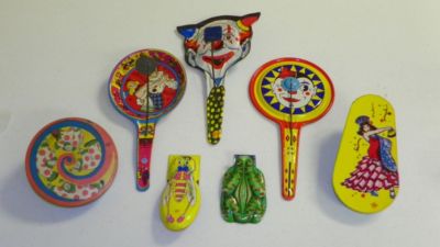 Lot of 7 Vintage Tin Noise Maker Toys #E13