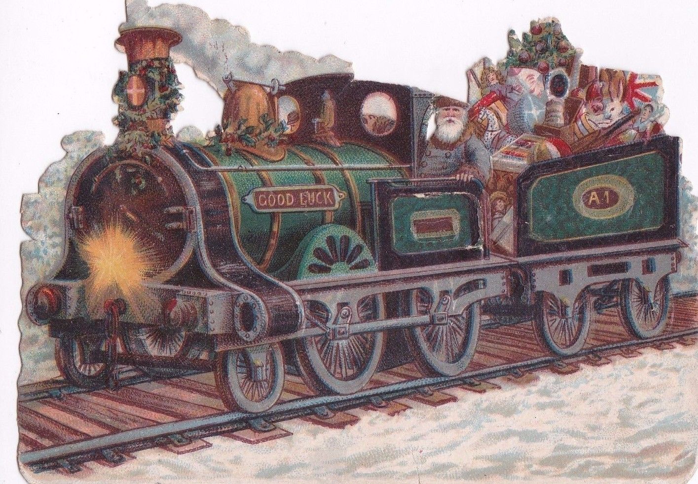Antique Victorian Vintage Christmas Die Cut Santa On Green Train W/ Toys