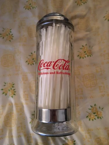 Title (ebay affiliate link): Vintage 1992 Coke Coca-Cola Glass and Chrome Straw Holder