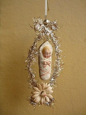 Title (ebay affiliate link): VTG.PAPIER BABY CHRISTMAS TREE ORNAMENT IN TINSEL ROUND