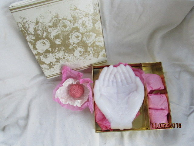 Vintage Estate Avon Touch of Beauty Soap Dish 4 Soaps White Milk Glass Hands