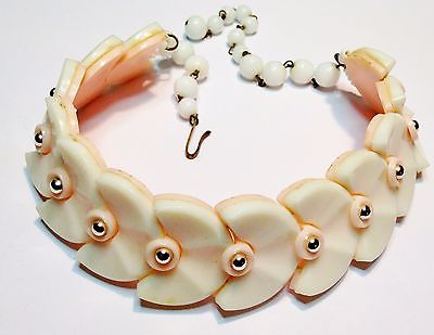 VTG Signed W Germany Pink White Silver Dot Milk Glass & Lucite RETRO Necklace
